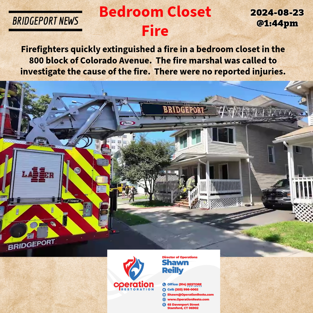 Firefighters quickly extinguished a fire in a bedroom closet in the 800 block of Colorado Avenue. The fire marshal was called to investigate the cause of the fire. There were no reported injuries. 2024-08-23@1:44pm--#Bridgeport CT-- #cttraffic