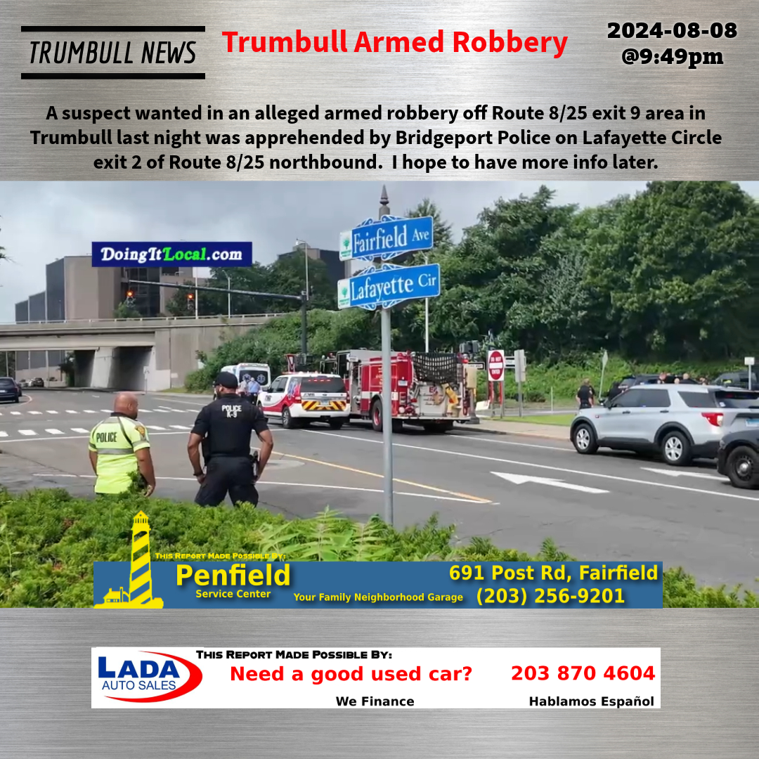 Trumbull last night was apprehended by Bridgeport Police on Lafayette Circle exit 2 of Route 8/25 northbound. I hope to have more info later.