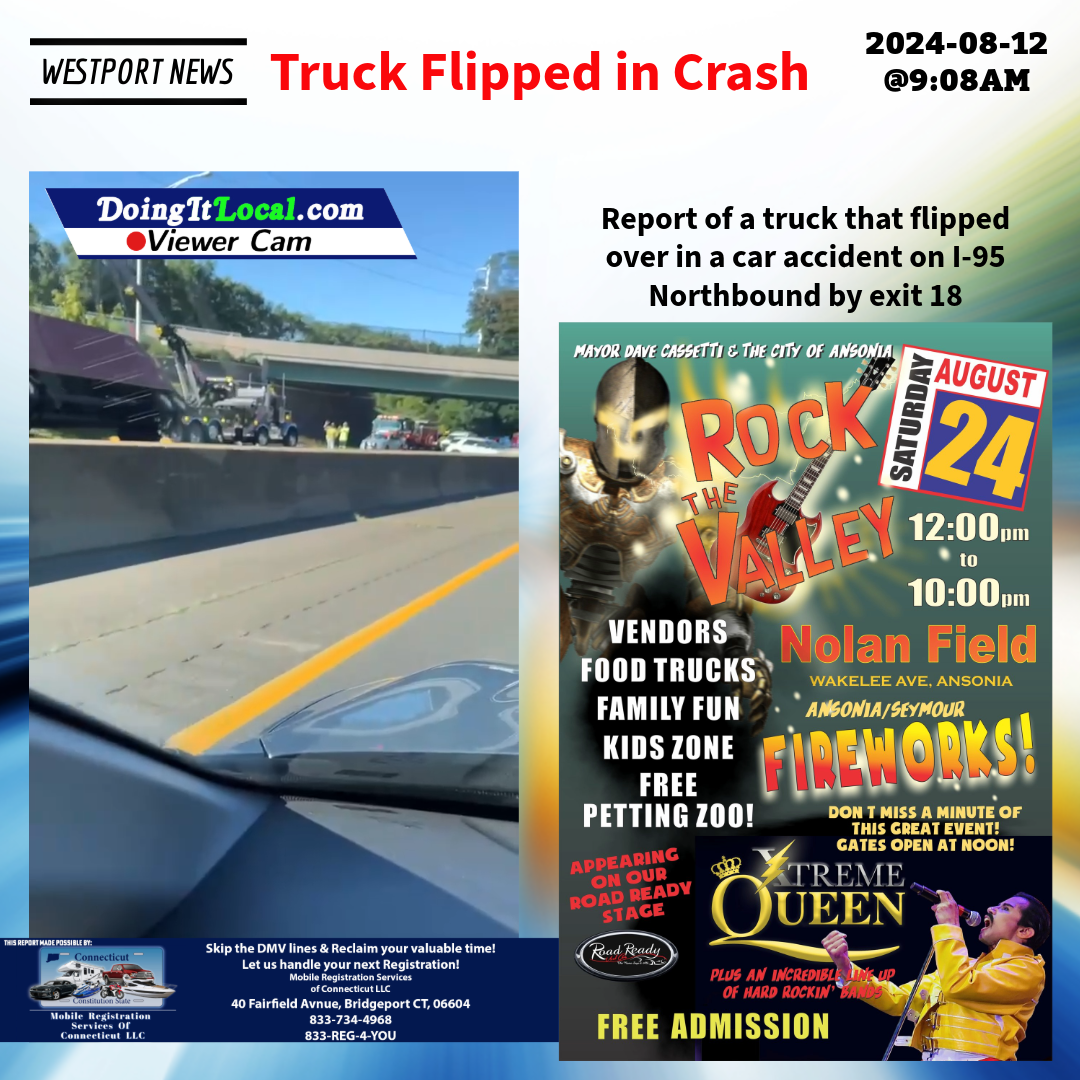 Report of a truck that flipped over in a car accident on I-95 Northbound by exit 18 Post navigation Westport News: Highway Crash! Trumbull Robbery Suspects Apprehended in Westport