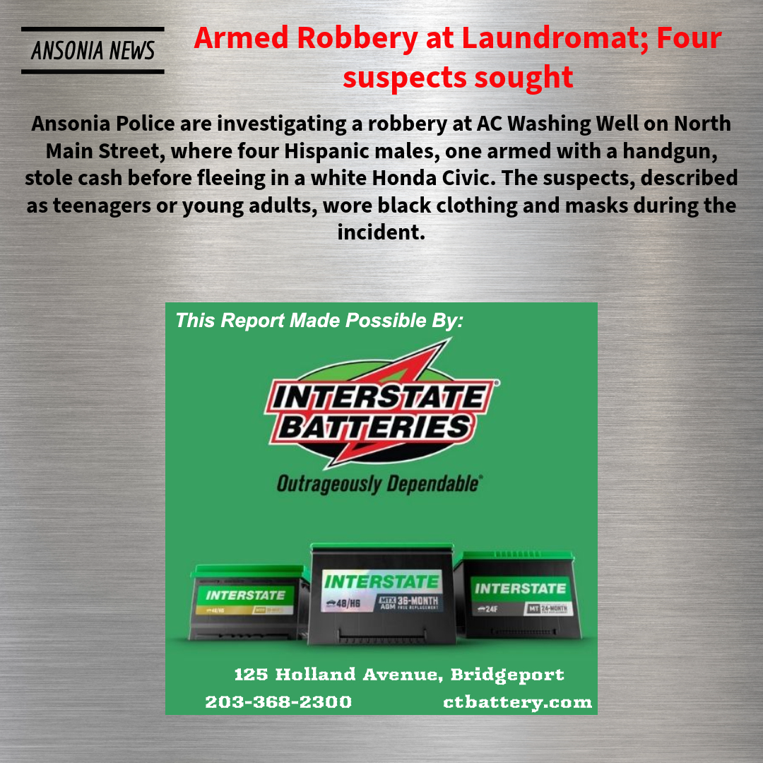 On August 31, 2024 at 7:12 P.M., the Ansonia Police Department investigated a robbery at the AC Washing Well, 133 North Main Street. An employee reported that four Hispanic males enter the business and a short time later one of the males approached, displayed a handgun and demanded money. The suspect took money from the register and another area of the business and all four males then fled the store leaving in a white Honda Civic. The suspects were described as follows; male 19 to 20 years old wearing black pants, hoodie, and sneakers wearing a black mask armed with a handgun, male 16 years old wearing black pants, hoodie and sneakers, male 16 years old wearing black pants, hoodie and sneakers with white lettering on the hoodie, and male 16 years old wearing black pants and hoodie, white shirt and sneakers with a white hat.