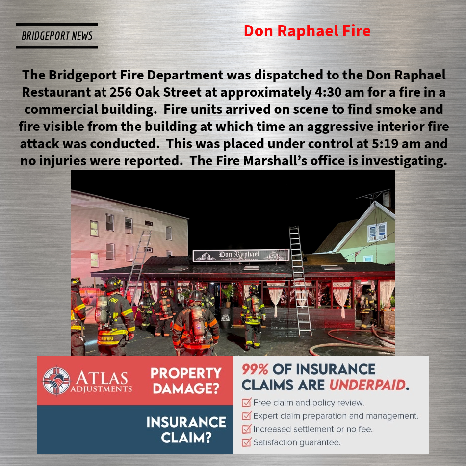 The Bridgeport Fire Department was dispatched to the Don Raphael Restaurant at 256 Oak Street at approximately 4:30 am for a fire in a commercial building. Fire units arrived on scene to find smoke and fire visible from the building at which time an aggressive interior fire attack was conducted. This was placed under control at 5:19 am and no injuries were reported. The Fire Marshall’s office is investigating.