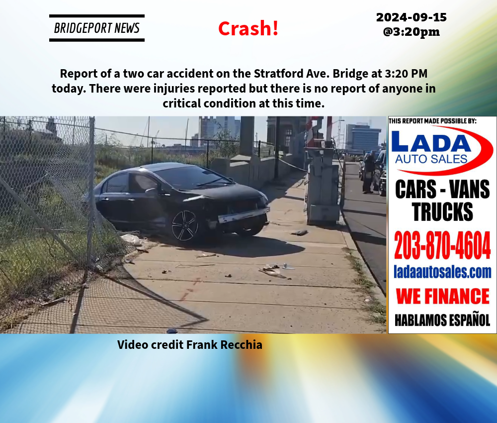 Report of a two car accident on the Stratford Ave. Bridge at 3:20 PM today. There were injuries reported but there is no report of anyone in critical condition at this time. Video credit: Frank Recchia