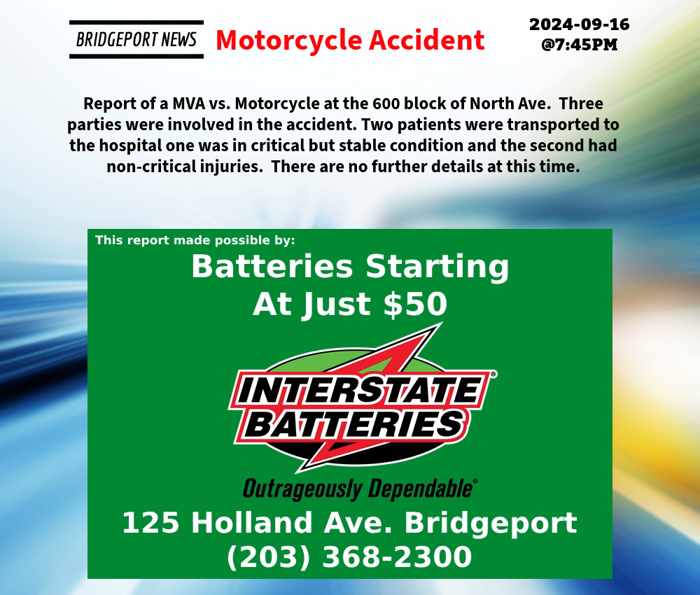 Report of a MVA vs. Motorcycle at the 600 block of North Ave. Three parties were involved in the accident. Two patients were transported to the hospital one was in critical but stable condition and the second had non-critical injuries. There are no further details at this time.