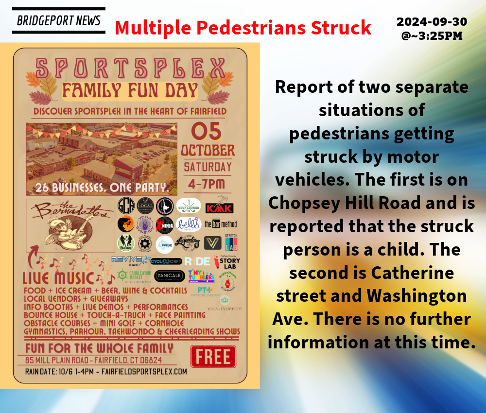 Report of two separate situations of pedestrians getting struck by motor vehicles. The first is on Chopsey Hill Road and is reported that the struck person is a child. The second is Catherine street and Washington Ave. There is no further information at this time.