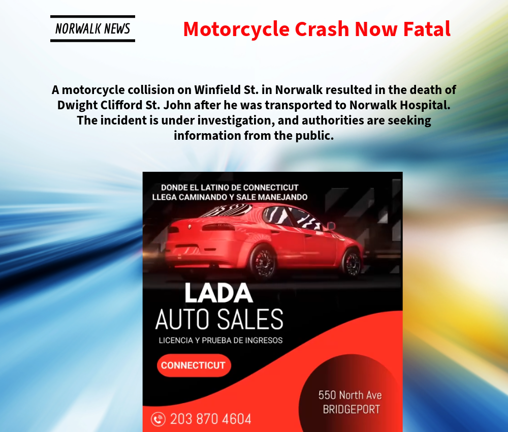 On September 14, 2024, at 5:38 PM, Norwalk Combined Dispatch received a 911 call reporting a motorcycle collision with a vehicle on Winfield St. near the intersection of Pequot Dr. Norwalk Police, Norwalk Fire Department, and Norwalk Hospital Emergency Medical Service responded immediately and provided medical aid to the motorcycle operator, Dwight Clifford St. John of Norwalk. St. John was transported to Norwalk Hospital by ambulance, where he later succumbed to his injuries.