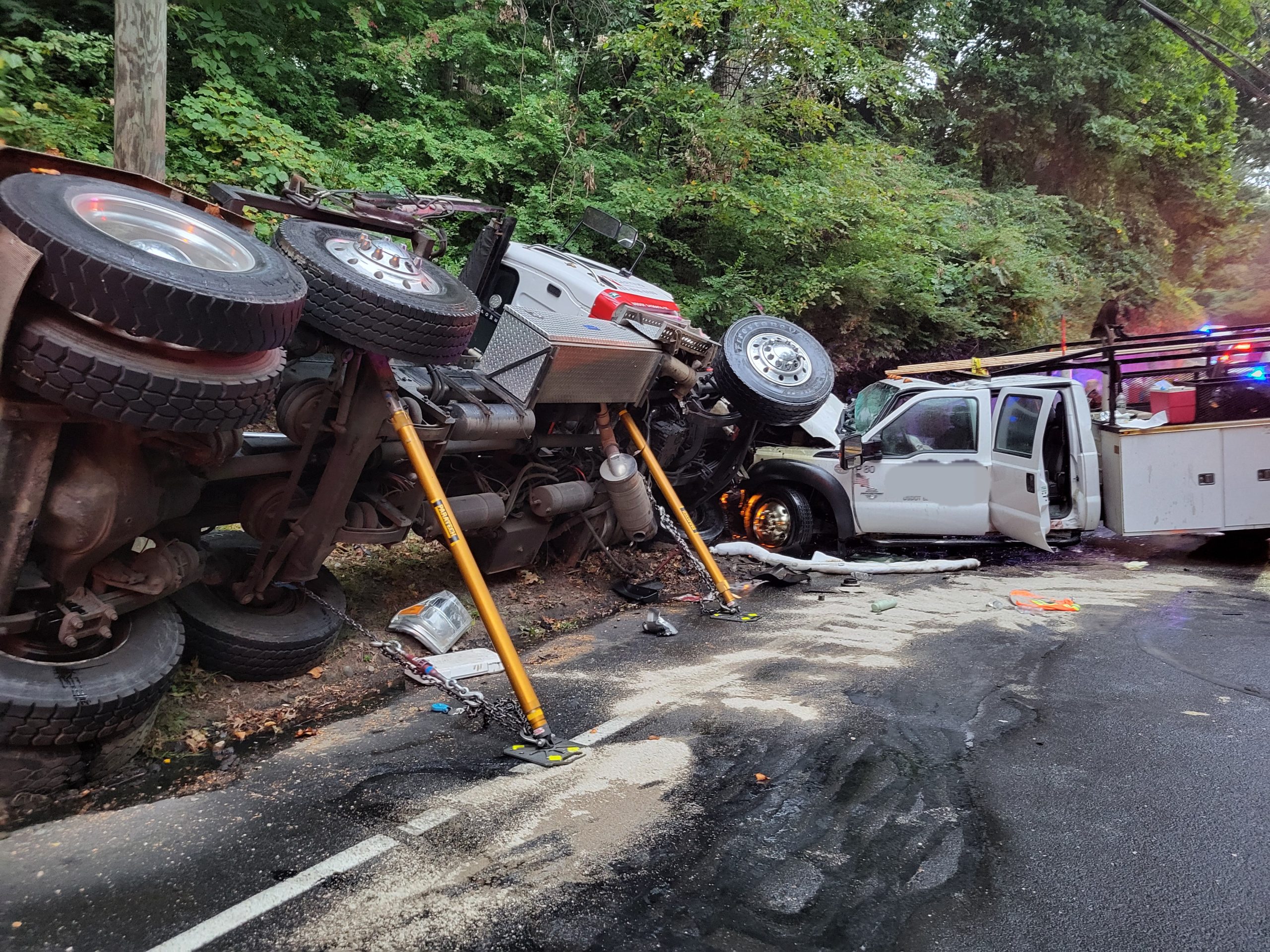Upon arrival, firefighters found a utility truck with heavy front-end damage and one occupant trapped inside. There was an active diesel leak, and a roll-off truck was heavily damaged and on its side. Firefighters deployed a protective hose line due to the diesel leak and stabilized the utility truck before using battery-operated rescue tools to extricate the trapped occupant in under 10 minutes. Simultaneously, other firefighters worked to stabilize the rolled-over truck.