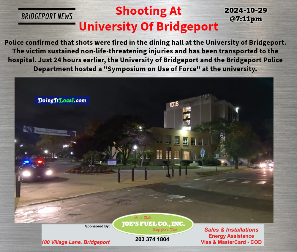 Police confirmed that shots were fired in the dining hall at the University of Bridgeport. The victim sustained non-life-threatening injuries and has been transported to the hospital. Just 24 hours earlier, the University of Bridgeport and the Bridgeport Police Department hosted a "Symposium on Use of Force" at the university.