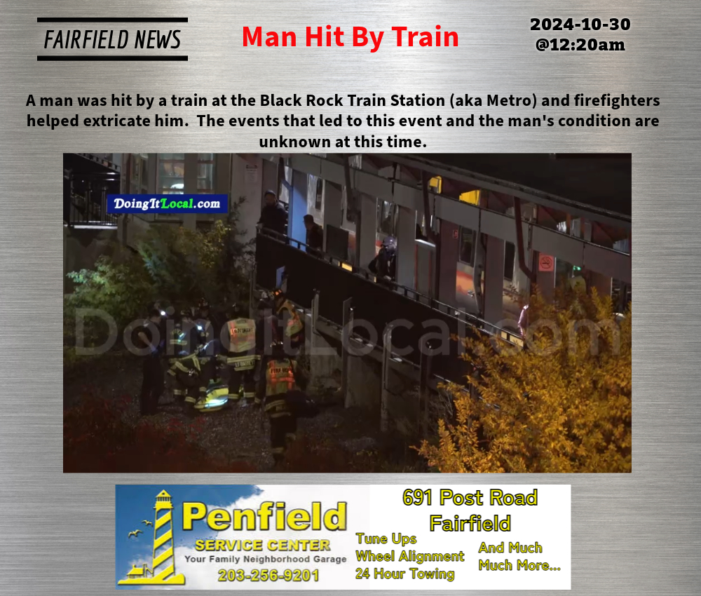 A man was hit by a train at the Black Rock Train Station (aka Metro) and firefighters helped extricate him. The events that led to this event and the man's condition are unknown at this time. 2024-10-30@12:20am--#Fairfield CT-- #MTA
