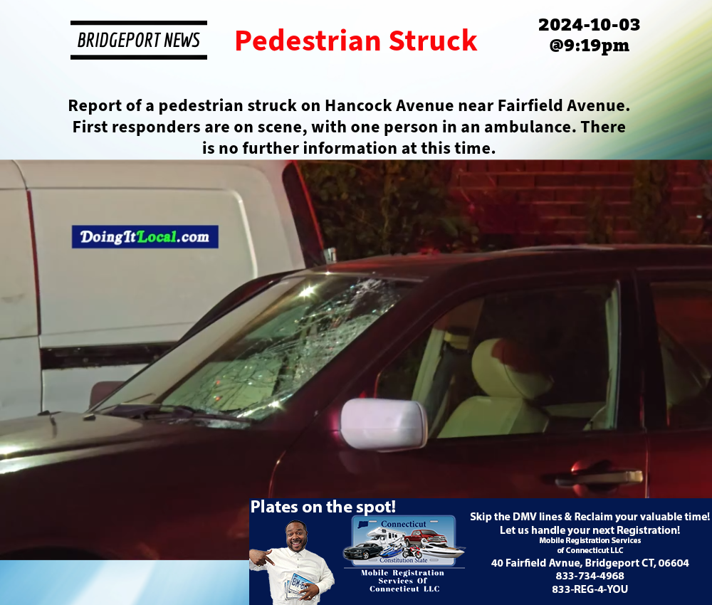 Report of a pedestrian struck on Hancock Avenue near Fairfield Avenue.