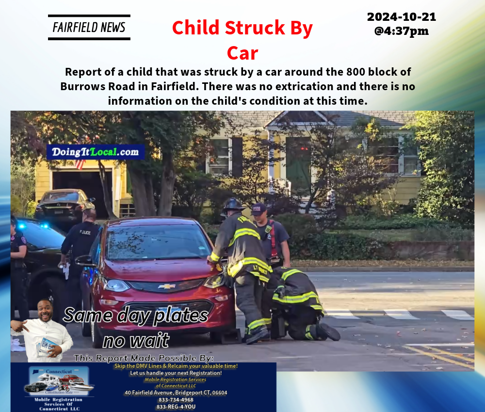Police said: On October 21, at approximately 4:20 PM, a report was received of a child being struck by a vehicle in the area of Burroughs Road and Fairfield Woods Road. The 12-year-old was transported to a local hospital and is being treated for what appear to be minor, non-life-threatening injuries. The driver was cited for violating CGS 14-300(c), Failure to Yield to a Pedestrian in a Crosswalk. Excessive sun glare is believed to have been a contributing factor in the incident.