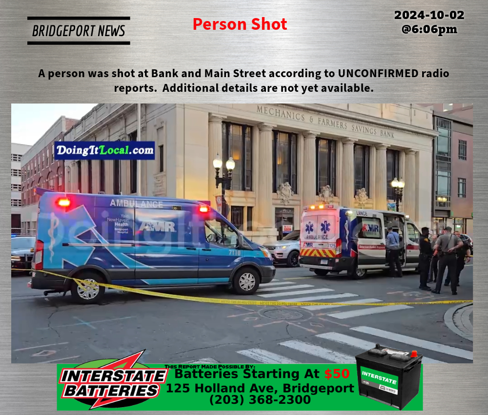 A person was shot at Bank and Main Street according to UNCONFIRMED radio reports. Additional details are not yet available. 2024-10-02@6:06pm--#Bridgeport CT