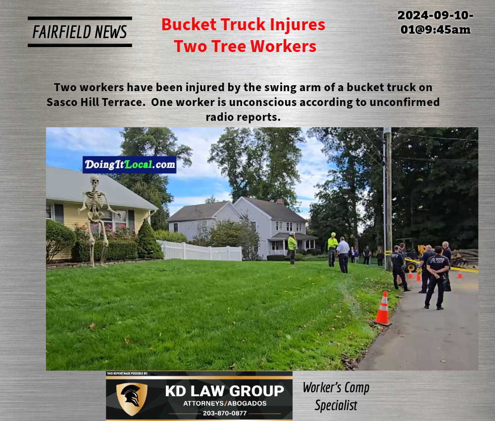 Two workers have been injured by the swing arm of a bucket truck on Sasco Hill Terrace. One worker is unconscious according to unconfirmed radio reports. 2024-09-10-01@9:45am#Fairfield