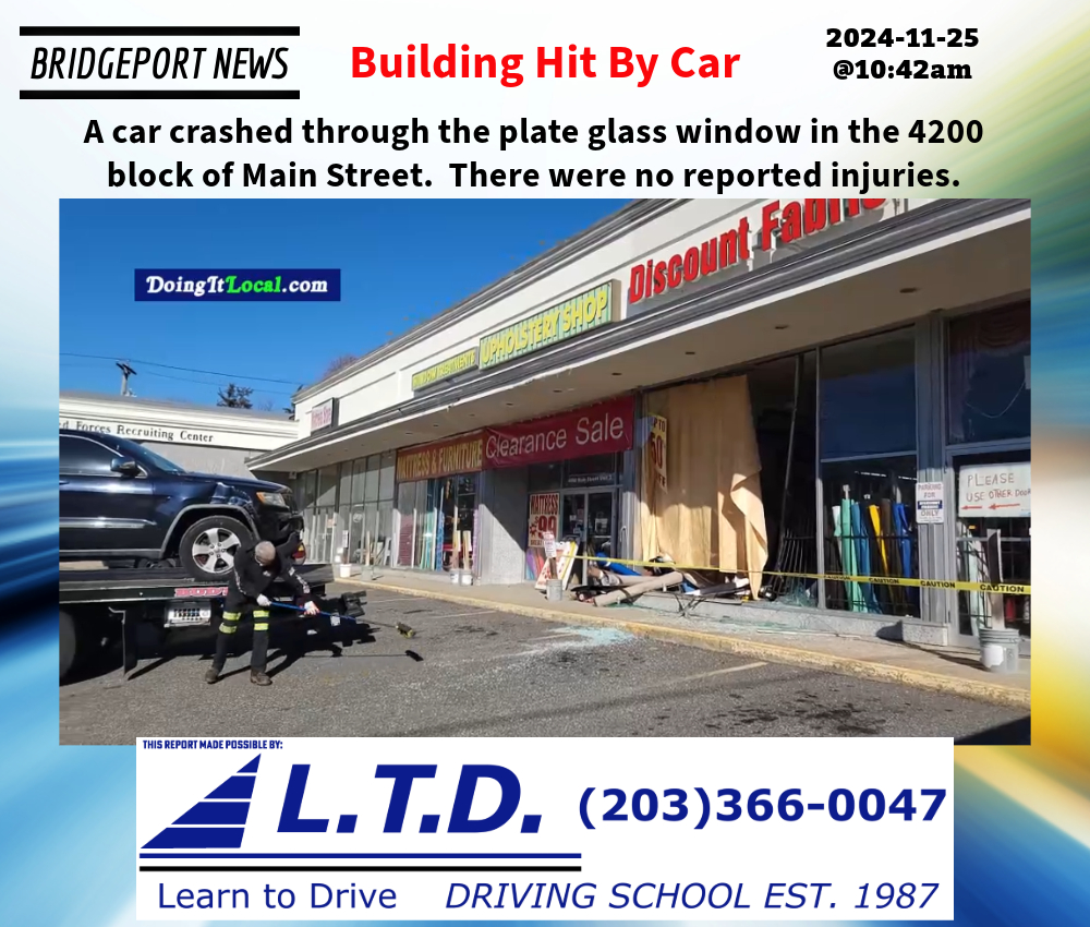 A car crashed through the plate glass window in the 4200 block of Main Street. There were no reported injuries.