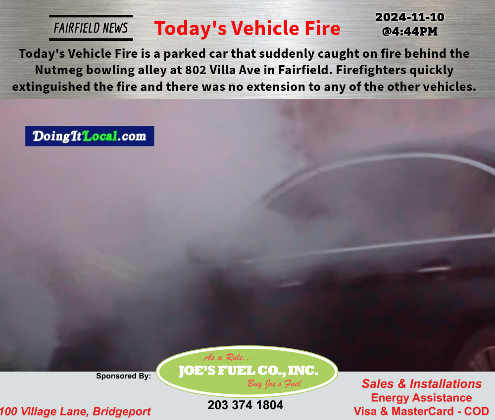 Today’s Vehicle Fire is a parked car that suddenly caught on fire behind the Nutmeg bowling alley at 802 Villa Ave in Fairfield. Firefighters quickly extinguished the fire and there was no extension to any of the other vehicles.