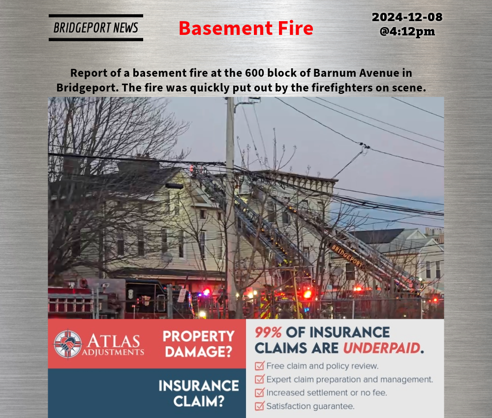 Report of a basement fire at the 600 block of Barnum Avenue in Bridgeport. The fire was quickly put out by the firefighters on scene.