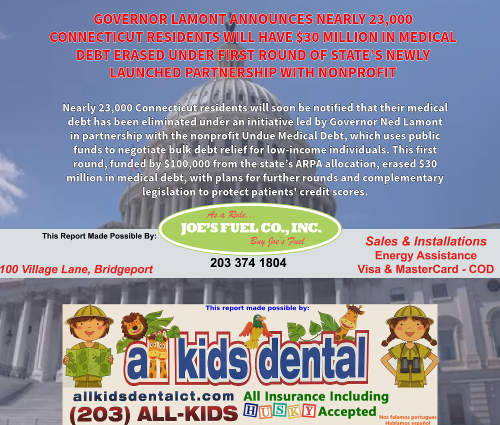 Letters Will Be Mailed Beginning December 23 Notifying Individuals and Families That Their Medical Debt Has Been Erased (HARTFORD, CT) – Governor Ned Lamont today announced that nearly 23,000 Connecticut residents who have medical debt will be notified in the coming days that some or all of that debt has been eliminated under the first round of a major initiative his administration launched through a partnership with the national nonprofit organization Undue Medical Debt. The nonprofit contracts with state and local governments and leverages public investments to negotiate with hospitals and other providers on the elimination of large, bundled portfolios of qualifying medical debt owed by patients whose income is at or below four times (400%) the federal poverty level…