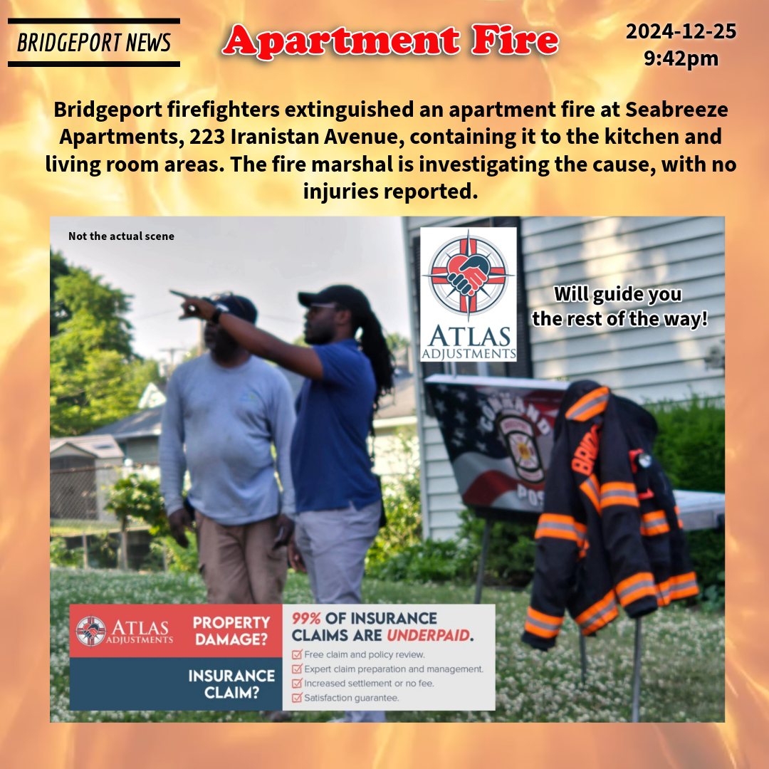 Bridgeport firefighters responded to an apartment fire at the Seabreeze Apartments, located at 223 Iranistan Avenue, earlier today.