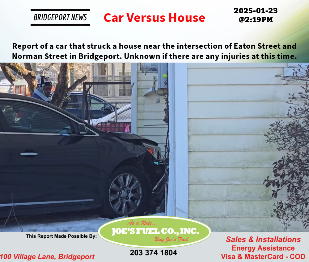 Report of a car that struck a house near the intersection of Eaton Street and Norman Street in Bridgeport. Unknown if there are any injuries at this time.
