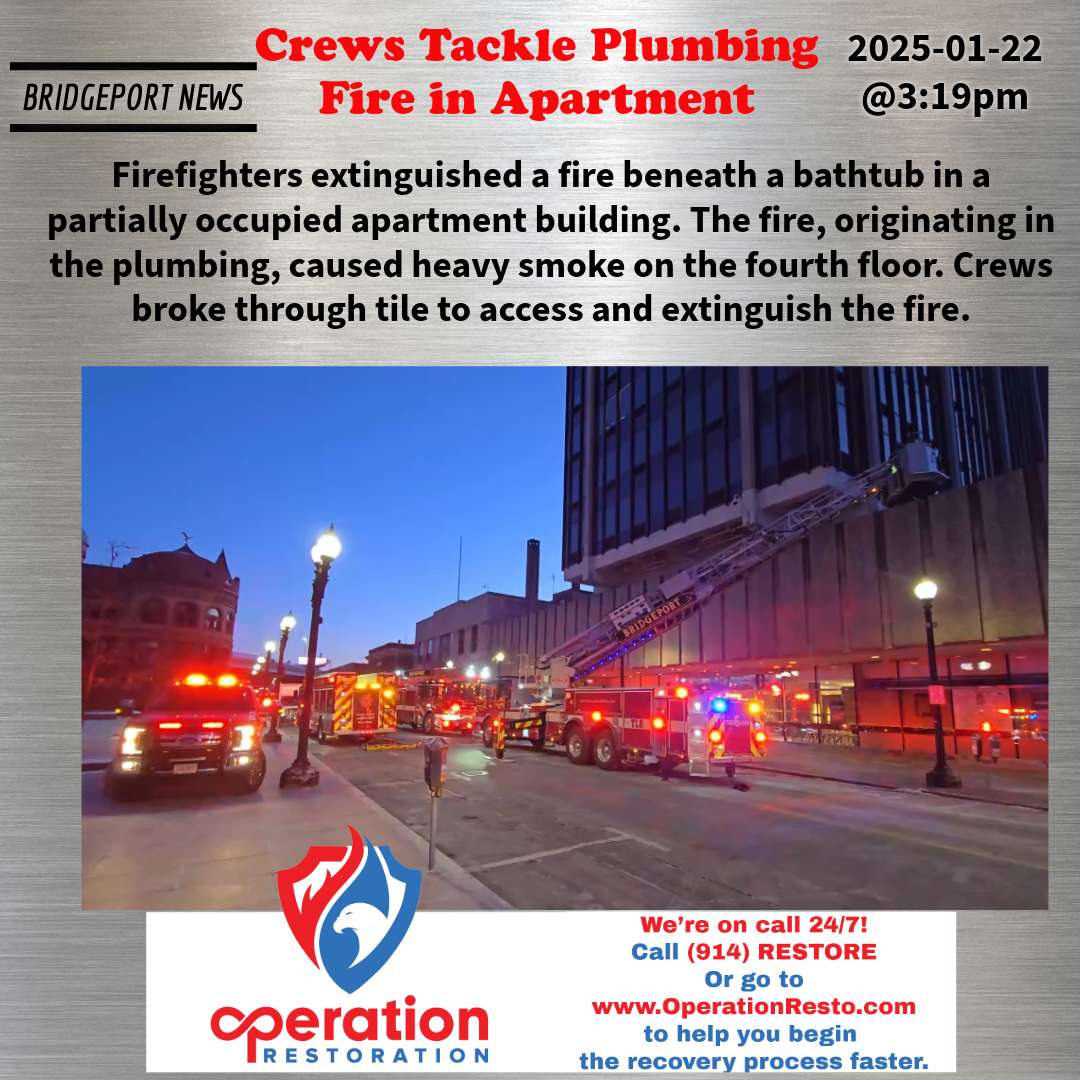 Bridgeport Firefighters responded to a building that’s partially occupied and has been converted into apartments in the 800 block of Main Street. There was a fire in the plumbing system that extended into a fourth-floor apartment. Crews encountered heavy smoke in the unit but managed to extinguish the fire, which was located beneath the bathtub. They had to break through the tile and open up the area to fully address the issue.