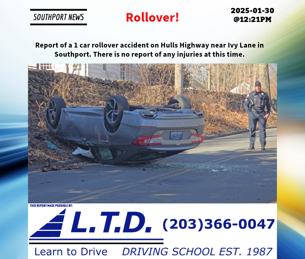 Report of a 1 car rollover accident on Hulls Highway near Ivy Lane in Southport. There is no report of any injuries at this time.