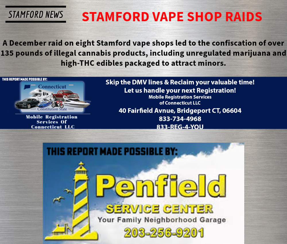The raids were conducted jointly by the Office of the Attorney General, the Department of Consumer Protection, Stamford Police Department Narcotics & Organized Crime Unit, State Police, Department of Mental Health and Addiction Services, Department of Labor, and Department of Revenue Services on December 19.