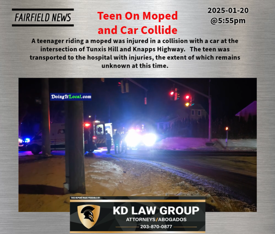 A teenager riding a moped was injured in a collision with a car at the intersection of Tunxis Hill and Knapps Highway on Monday evening.