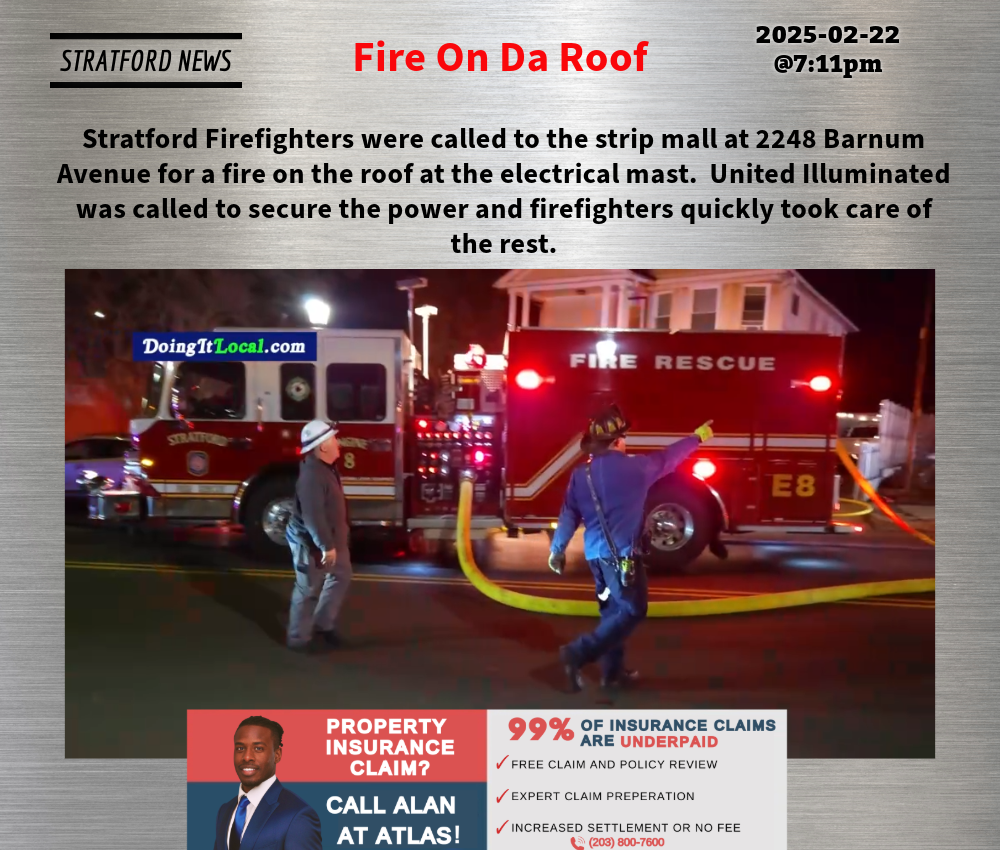 Stratford Firefighters were called to the strip mall at 2248 Barnum Avenue for a fire on the roof at the electrical mast. United Illuminated was called to secure the power and firefighters quickly took care of the rest. 2025-02-22@7:11pm--#Stratford CT-- #ctfire