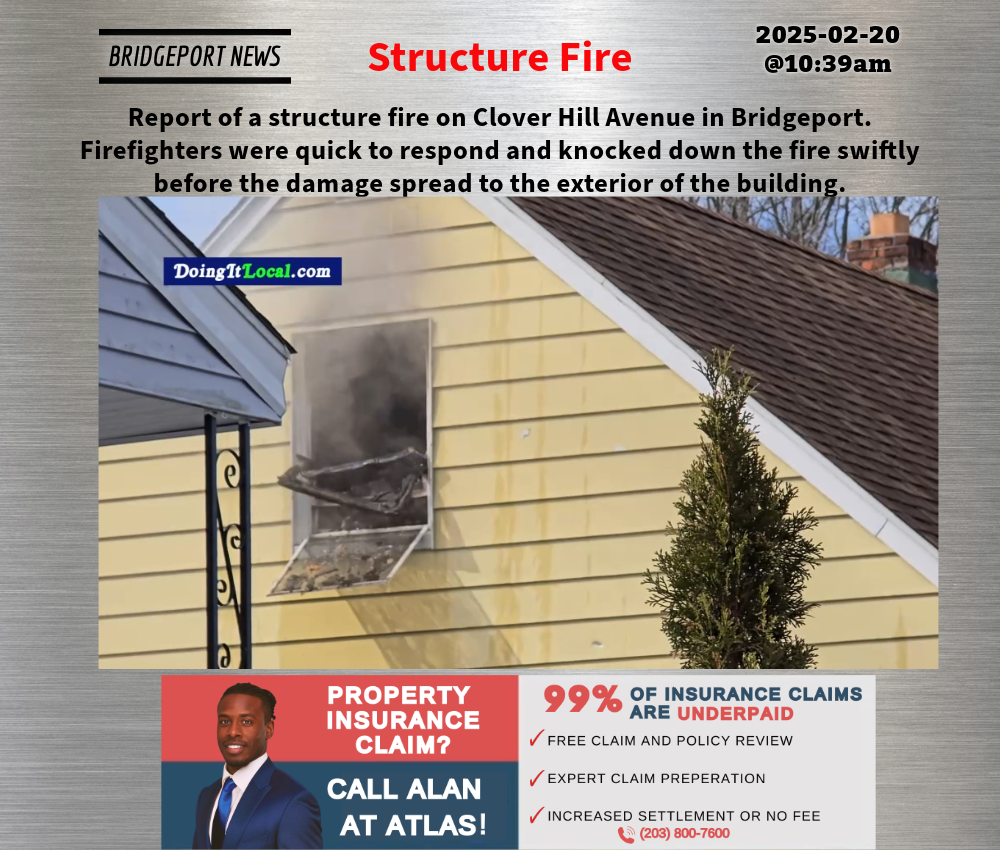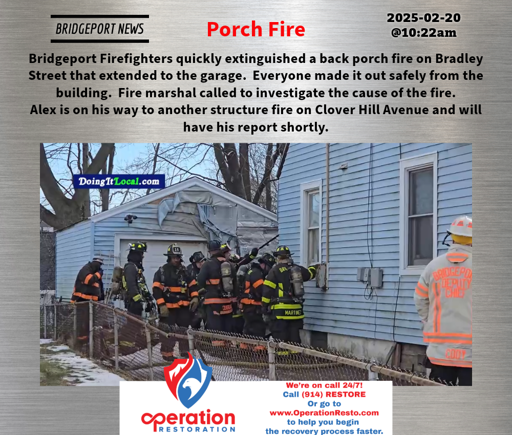Bridgeport Firefighters quickly extinguished a back porch fire on Bradley Street that extended to the garage. Everyone made it out safely from the building. Fire marshal called to investigate the cause of the fire. Alex is on his way to another structure fire on Clover Hill Avenue and will have his report shortly. 02-20@10:22am--#Bridgeport CT-- #bridgectfire