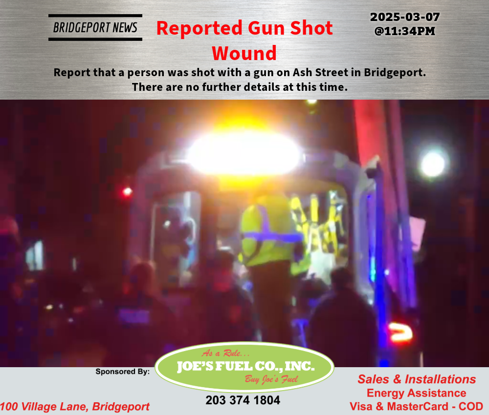 Report that a person was shot with a gun on Ash Street in Bridgeport. There are no further details at this time.