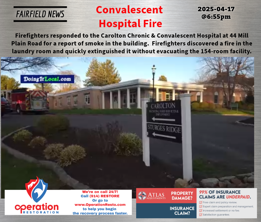 Firefighters responded to the Carolton Chronic & Convalescent Hospital at 44 Mill Plain Road for a report of smoke in the building. Firefighters discovered a fire in the laundry room and quickly extinguished it without evacuating the 154-room facility.