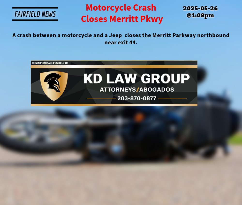 A crash between a motorcycle and a Jeep closes the Merritt Parkway northbound near exit 44.