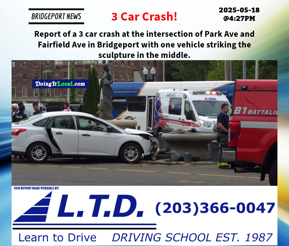 Report of a 3 car crash at the intersection of Park Ave and Fairfield Ave in Bridgeport with one vehicle striking the sculpture in the middle.