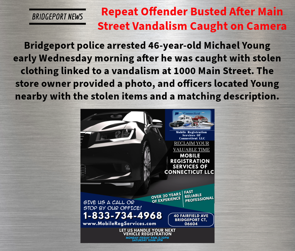 Bridgeport police officers called out a vandalism complaint at 1000 Main Street. EOC Dispatch relayed that the store owner, Dave Schneider, had a clear photograph of the suspect. Upon arrival, officers obtained the image and canvassed the surrounding area. A male matching the description, identified as 46-year-old Michael Young of Bridgeport, was located riding a white and purple bicycle near Fairfield Avenue and Seely Street. After initially refusing verbal commands, officers detained Young at 856 Fairfield Avenue. A search of Young’s possessions revealed a black Nautica jacket matching the suspect description and a plastic bag containing black jean shorts and a hoodie with tags still attached later confirmed stolen by Schneider. Schneider conducted an in-person identification and positively identified Young as the offender. Young was transported without incident to 300 Congress Street for booking. He was also involved in previous burglaries at this location.