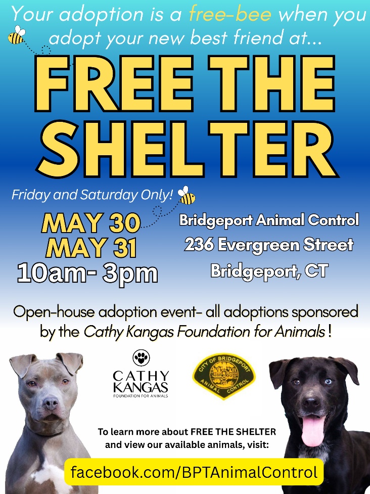 Bridgeport, CT – The Bridgeport Animal Control is hosting the return of their “Free the Shelter” event on May 30th and May 31st with the intent to have a large amount of their animals adopted. All adoption fees are sponsored by The Cathy Kangas Foundation for Animals in New Canaan as a part of the event’s initiative. Participants are encouraged to visit the Bridgeport Animal Shelter at 236 Evergreen Street between the hours of 10:00 AM-3:00 PM; no appointment needed. Participants will be able to fill out an application to get approved for a meet-and-greet with their preferred animal. Upon approval, participants will have their pets spayed or neutered, vaccinated, and microchipped prior to the animal being brought home. Eligibility requirements for participants include bringing proof of home ownership or a notarized letter from a landlord, bringing any other dogs that may be in the home if a participant wishes to adopt a dog, and bringing all members of the household, including children under 13. Please note, pets will not be sent home on the same day of adoption.