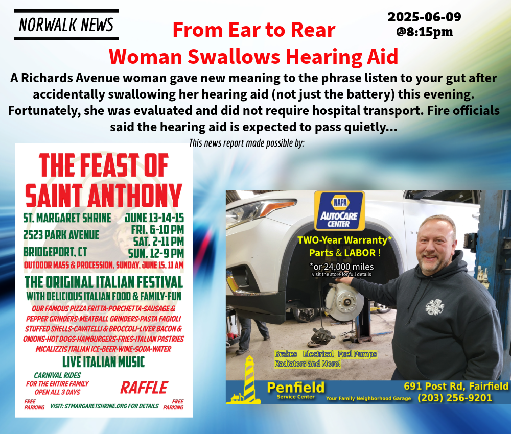 A Richards Avenue woman gave new meaning to the phrase listen to your gut after accidentally swallowing her hearing aid (not just the battery) this evening. Fortunately, she was evaluated and did not require hospital transport. Fire officials said the hearing aid is expected to pass quietly…