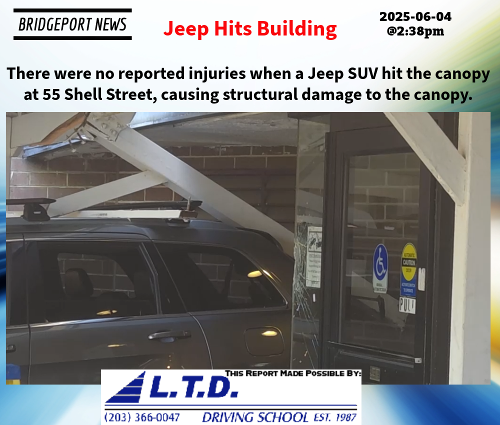 There were no reported injuries when a Jeep SUV hit the canopy at 55 Shell Street, causing structural damage to the canopy.