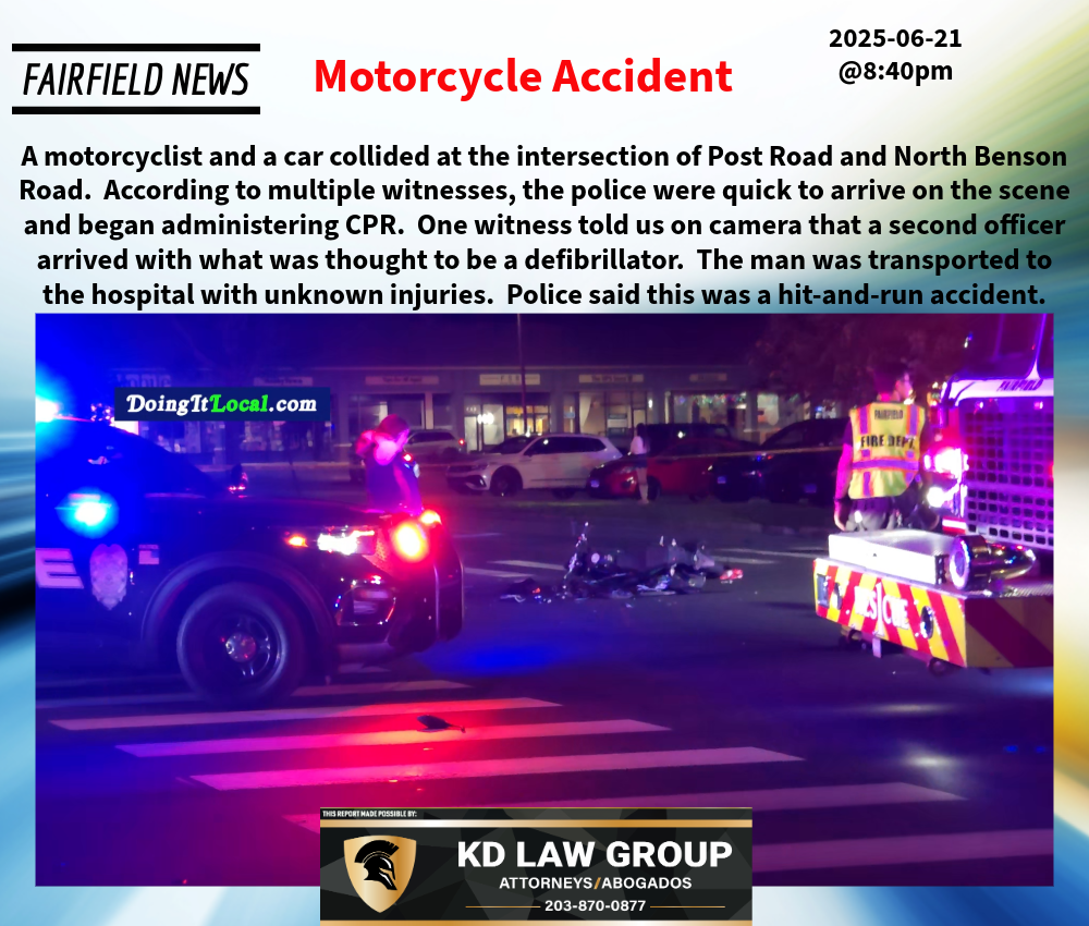 A motorcyclist and a car collided at the intersection of Post Road and North Benson Road. According to multiple witnesses, the police were quick to arrive on the scene and began administering CPR. One witness told us on camera that a second officer arrived with what was thought to be a defibrillator. The man was transported to the hospital with unknown injuries. Police said this was a hit-and-run accident.