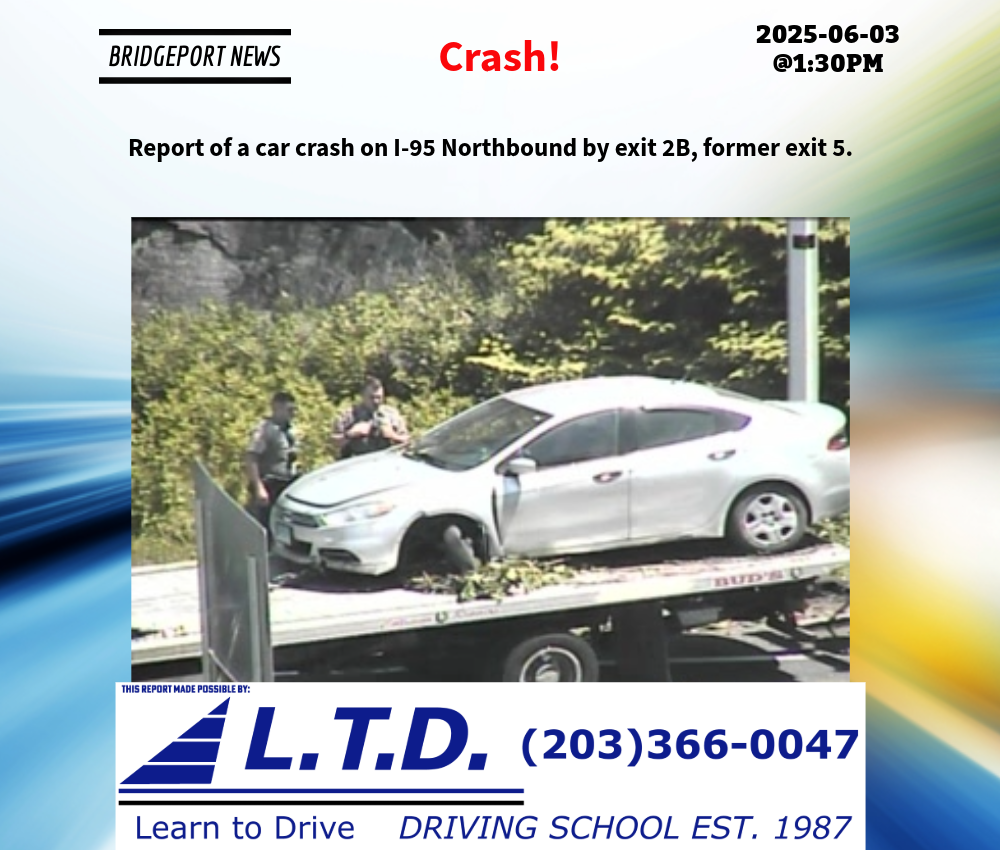 Report of a car crash on I-95 Northbound by exit 2B, former exit 5.