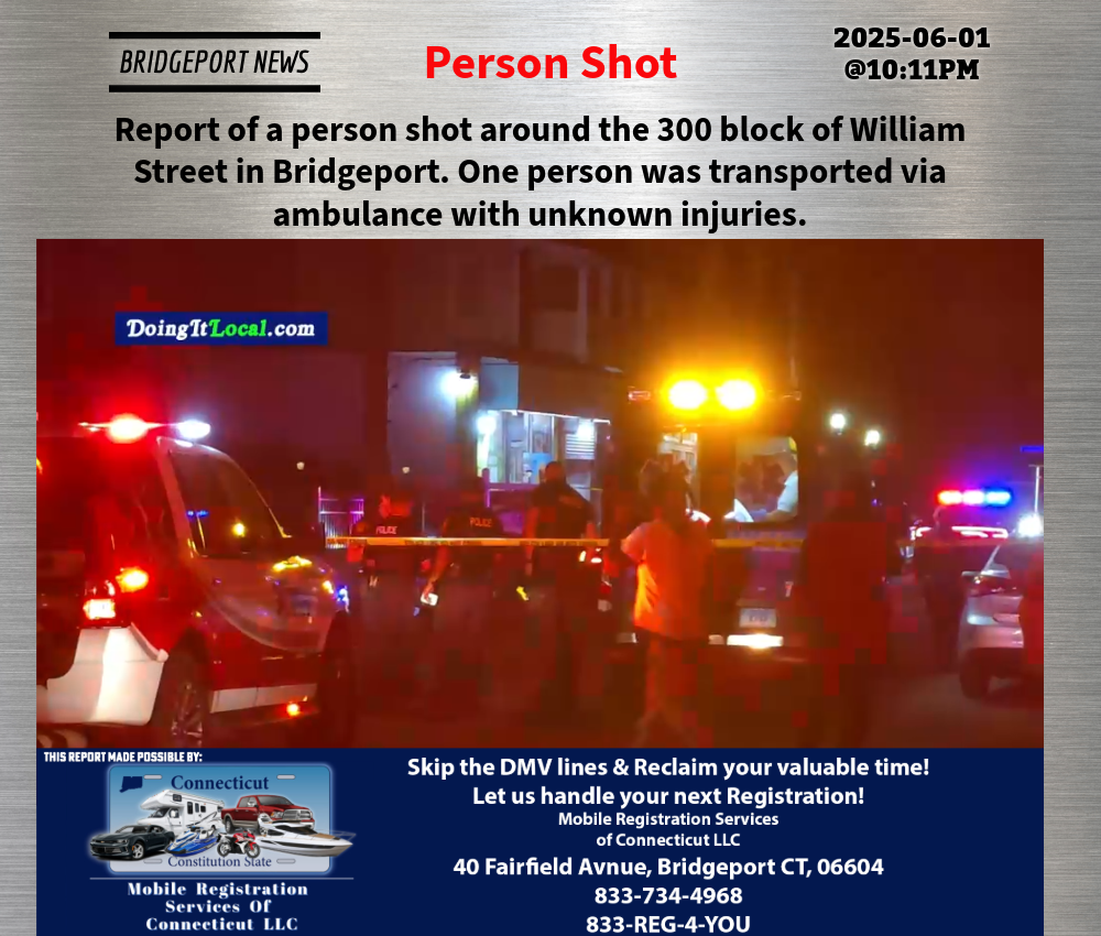 https://youtu.be/wJ5BLsuX1B0 Report of a person shot around the 300 block of William Street in Bridgeport. One person was transported via ambulance with unknown injuries.