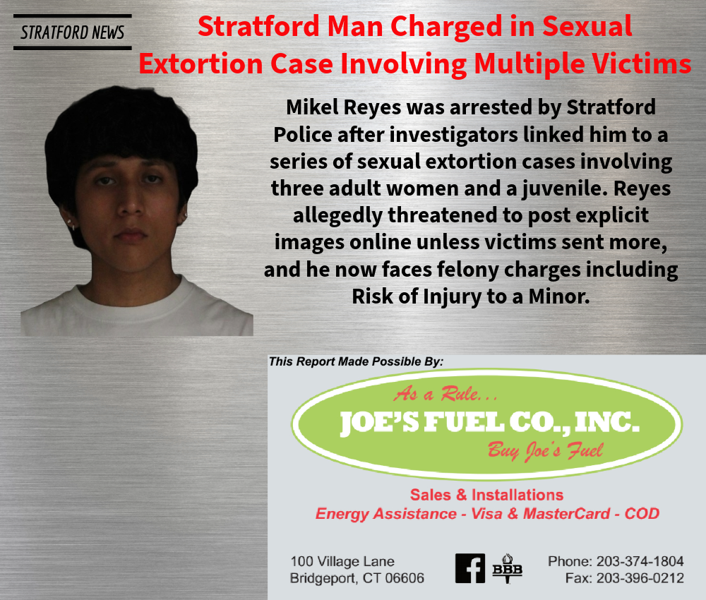 Stratford, CT – The Stratford Police Department has arrested a local man in connection with a series of sexual extortion cases involving multiple victims, including a juvenile. Over the course of three days in May 2025, three adult women came forward reporting that a male suspect had threatened to release sexually explicit images of them online unless they sent additional intimate photos.