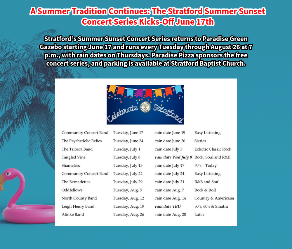 STRATFORD – The Stratford Department of Recreation is excited to announce that the 2025 Summer Sunset Concert Series will kick-off on Tuesday, June 17th. The concerts are performed at the Paradise Green Gazebo on Tuesdays through August 26th. In the event of inclement weather, concerts will be held the following Thursday. All concerts begin at 7:00pm.Paradise Pizza is the proud sponsor of this Celebrate Stratford Series.Those attending the Summer Concerts Series are welcome to park in the back of the Stratford Baptist Church at 131 Huntington Rd. The church asks that attendees keep off the grass at the church. We thank the Stratford Baptist Church for providing this accommodation.For more information about the Summer Concert Series and more Celebrate Stratford…