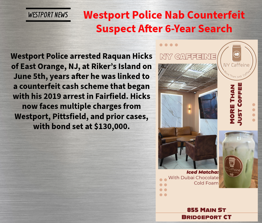 On June 5, 2025, Westport Detectives traveled to Riker’s Island and took Hicks, 29, of East Orange, NJ, into custody on the outstanding warrant. He was transported to Westport Police headquarters and charged with Conspiracy to Commit Larceny 6th and Conspiracy to Commit Forgery 1st. During booking, officers discovered Hicks also had an extraditable warrant from Pittsfield, MA, for similar charges, and a separate active rearrest warrant. He was additionally charged with being a Fugitive From Justice and Failure to Appear 1st.