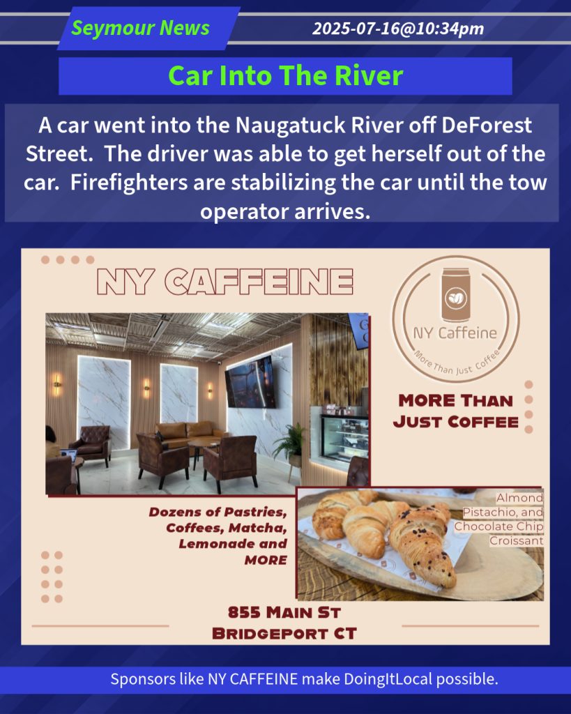A car went into the Naugatuck River off DeForest Street. The driver was able to get herself out of the car. Firefighters are stabilizing the car until the wreck arrives.