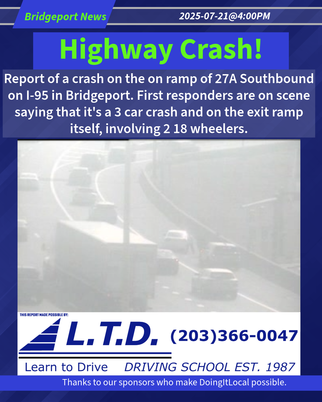Report of a crash on the on ramp of 27A Southbound on I-95 in Bridgeport. First responders are on scene saying that it’s a 3 car crash and on the exit ramp itself, involving 2 18 wheelers.