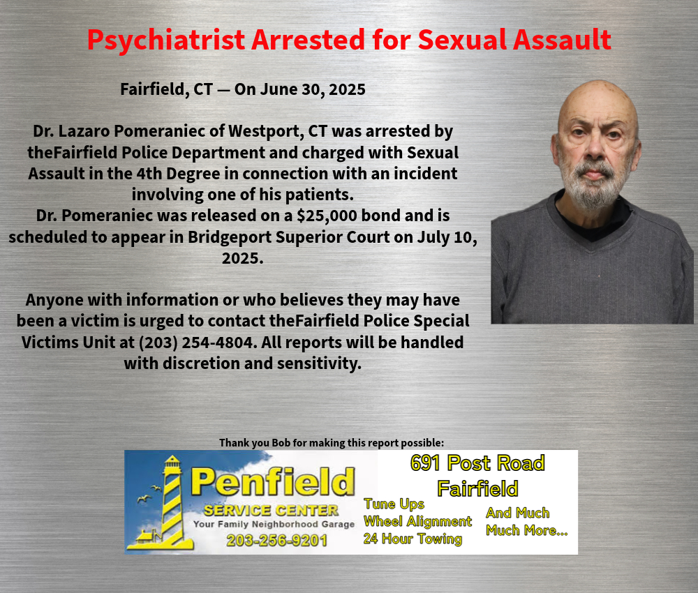 Fairfield, CT — On June 30, 2025, Dr. Lazaro Pomeraniec of Westport, CT was arrested by the