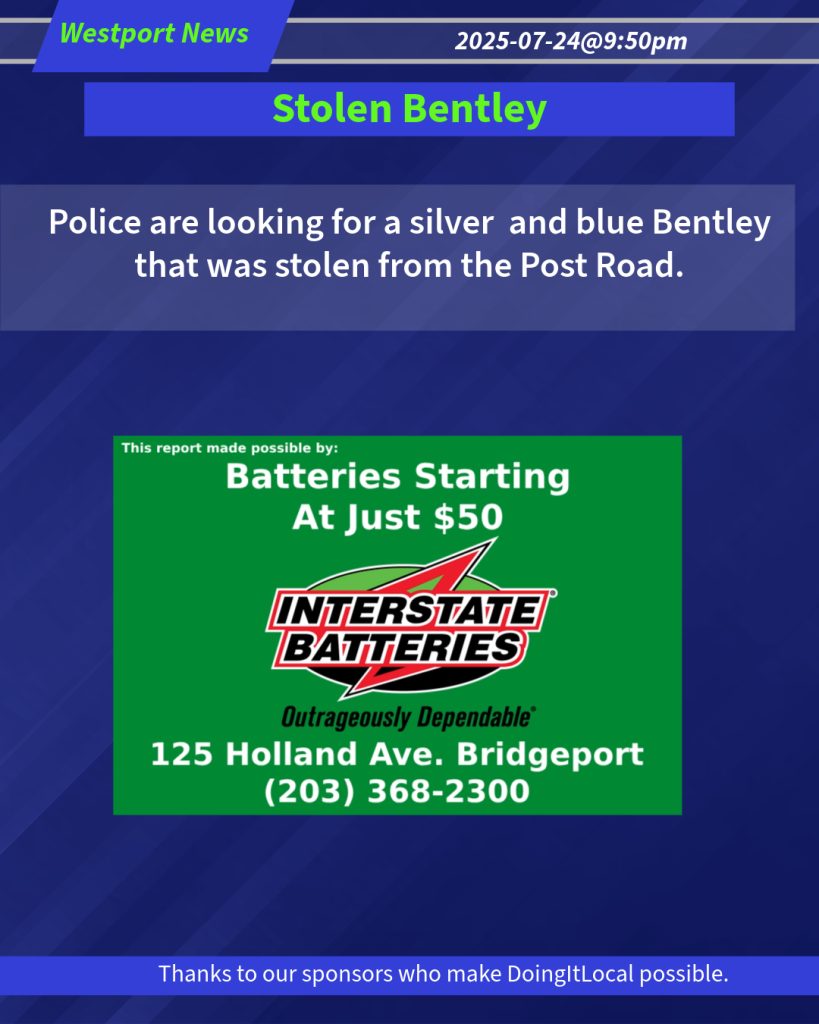 Police are looking for a silver and blue Bentley that was stolen from the Post Road.
