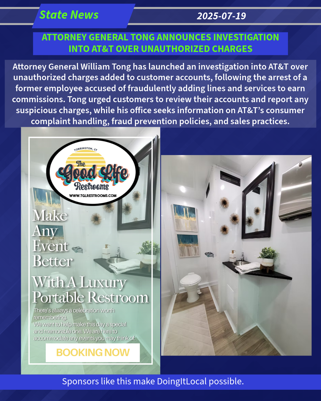 (Hartford, CT) – Attorney General William Tong today announced an investigation into AT&T over unauthorized charges added to customer accounts. The civil investigation follows criminal charges filed against a former AT&T employee in Stafford, Connecticut alleged to have added unauthorized lines to customer accounts in a ploy to earn bonuses and commissions.