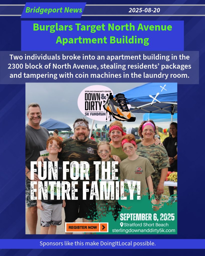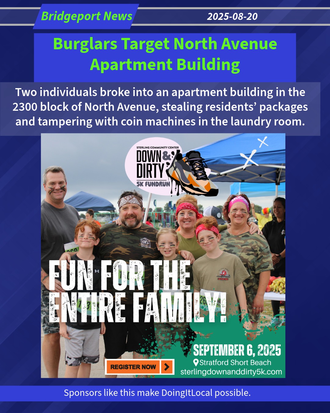 Two individuals broke into an apartment building in the 2300 block of North Avenue, stealing residents’ packages and tampering with coin machines in the laundry room. The property manager is meeting with the police to address the incident.