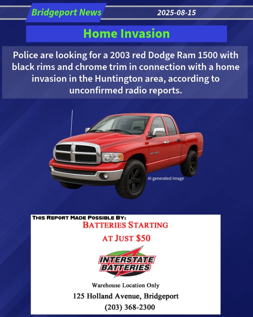 Police are looking for a 2003 red Dodge Ram 1500 with black rims and chrome trim in connection with a home invasion in the Huntington area, according to unconfirmed radio reports.