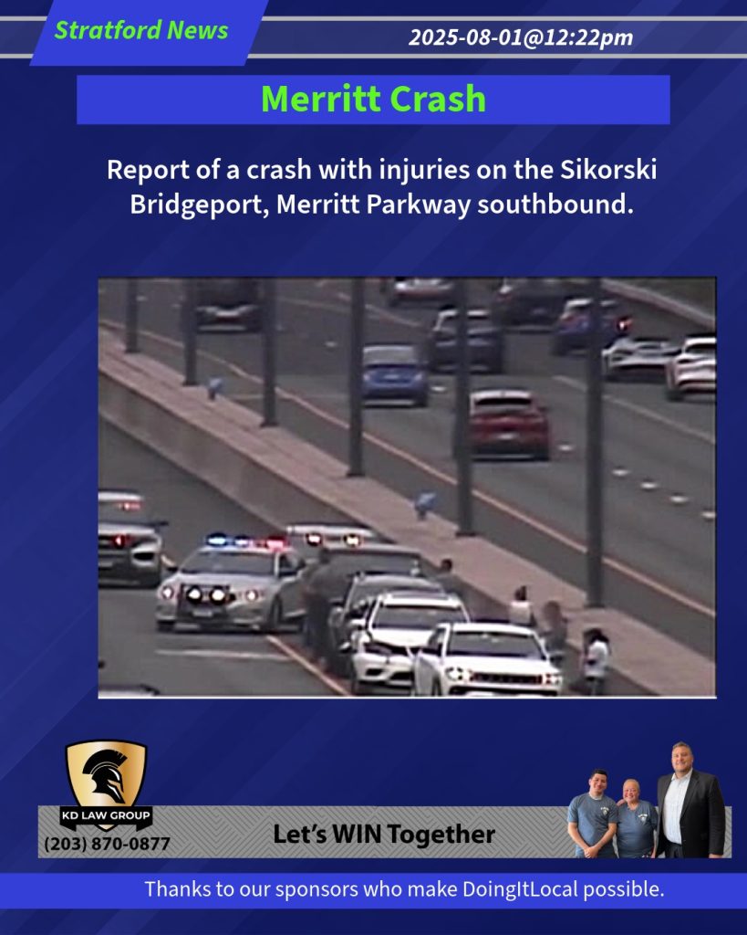 Report of a crash with injuries on the Sikorski Bridgeport, Merritt Parkway southbound.